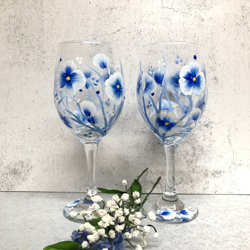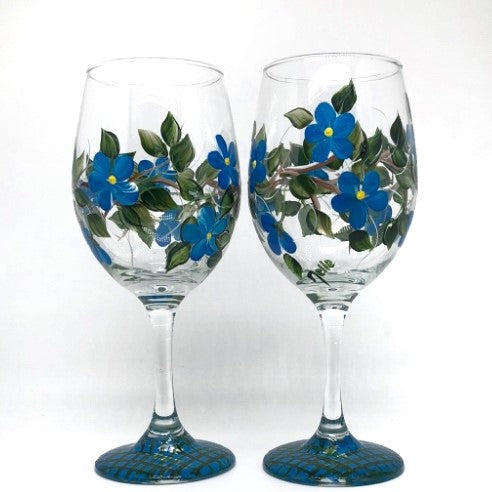 Hand Painted Wine Glasses - Blue and White Flowers (Set of 2)