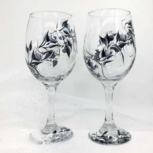 Black and White Rosebuds Wine Glasses (Set of 2)