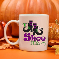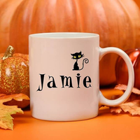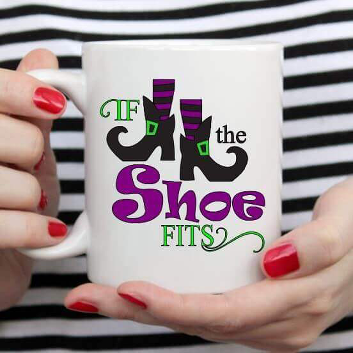 This Halloween coffee mug is the perfect gift idea for an October birthday. "If the shoe fits" with witches' boots on one side and personalized with name and a whimsical little kitty on the reverse side (optional) ...BOO!!