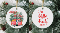 Add this Camper Christmas Ornament to your tree this year. Features a retro camper nestled in the pines and "Home for the Holidays" on the front and has the family last name and date on the reverse side. A wonderful, personalized keepsake gift to keep, or to give to friends who love to camp. A great hostess gift for campers. Each family name ornament comes in a gift box ready for gift giving!