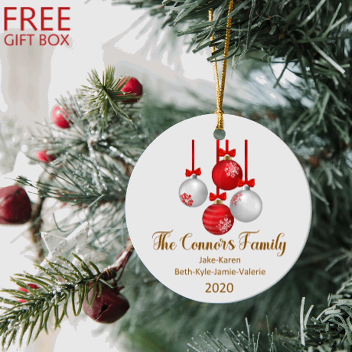 Add that extra special touch to your tree this year with our Family Name Ornament. This personalized ornament features two red and two white Christmas Ornaments with red bows and ribbon, and is customized with the last name, first names of family members and date. A wonderful keepsake gift to keep, give for a December birthday, anniversary or holiday hostess gift. Each ornament comes in a gift box ready for gift giving!