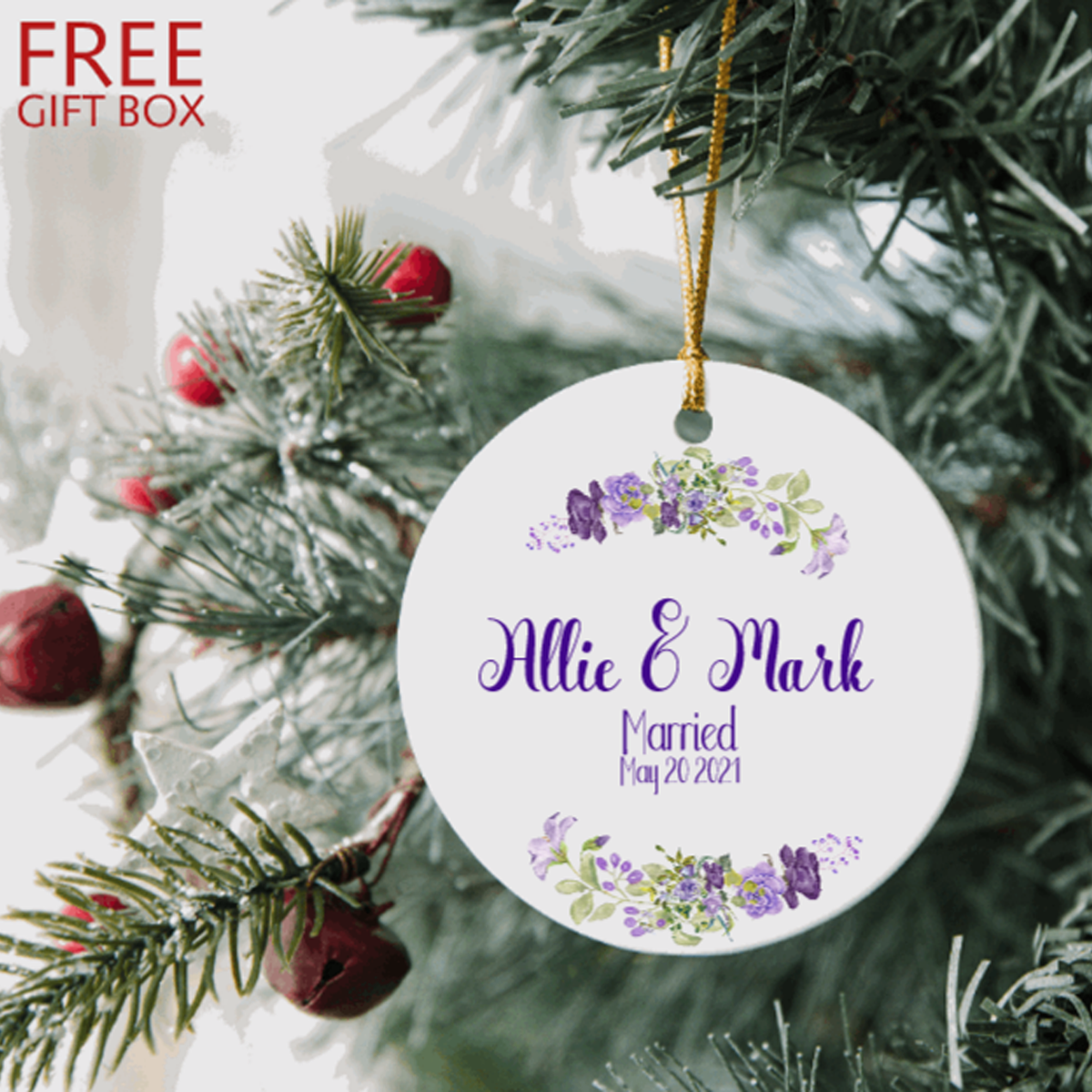 Add a special touch to your tree this year with our First Christmas Married Ornament. This personalized keepsake ornament features lovely flowers in shades of lavender with delicate green foliage and is customized with the couple's first names and the year they were married. A wonderful keepsake gift to keep or to give as part of a bridal shower gift. Each ornament comes in a gift box ready for gift giving!