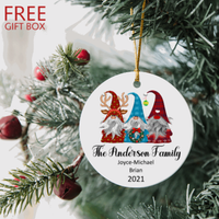 Add that extra special touch to your tree this year with our Family Name Ornament. This personalized ornament features 3 cute holiday gnomes with the family last name, first names and current year. A wonderful keepsake gift to keep, give for a December birthday or holiday hostess gift. Each ornament comes in a gift box ready for gift giving!
