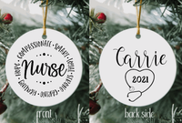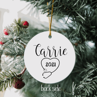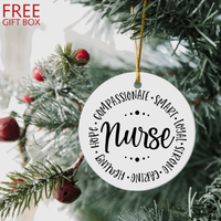 Nurse Ornament for a special nurse on your Christmas list. This personalized nurse ornament features the word Nurse in the center with "Compassionate, Smart, Loyal, Strong, Caring, Healing, Hope" around the edge on the front and personalized with the name, current year and a heart shaped stethoscope on the reverse side. A thoughtful keepsake for a registered nurse, nurse practitioner, school nurse or student nurse. Each ornament comes in a gift box ready for gift giving!