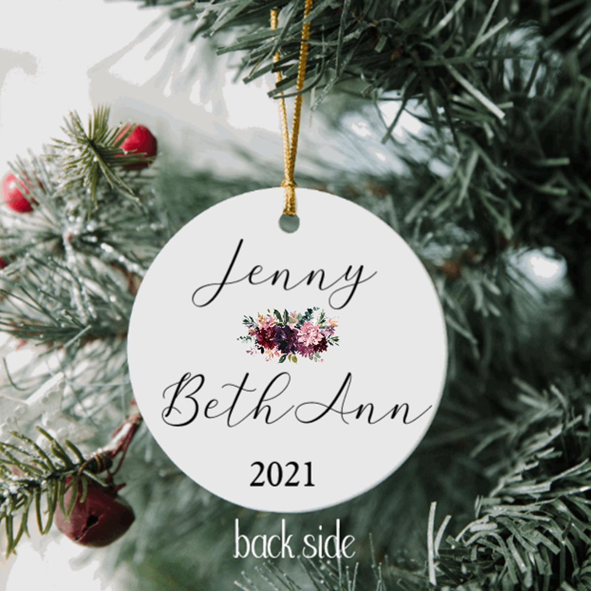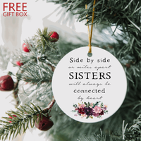 Celebrate your sister with our personalized Sister Christmas Ornament. This custom ornament features the saying "Side by side or miles apart, SISTERS will always be connected by heart" on one side with a burgundy and pink floral bouquet, and name(s) and current year on the reverse side. A wonderful keepsake gift for your sister(s) or a best friend who is "like a sister". Perfect for birthdays, Christmas, or a holiday hostess gift. Each ornament comes in a gift box ready for gift giving!