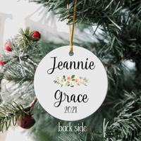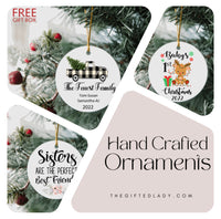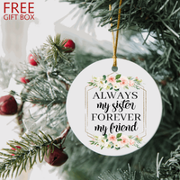Celebrate your sister with our personalized Sister Christmas Ornament. This custom ornament features the saying "Always my Sister, Forever my Friend" on one side with a delicate floral and gold border, with name(s) and current year on the reverse side. A wonderful keepsake gift for your sister or a special friend who is "like a sister". Perfect for birthdays, Christmas, or a holiday hostess gift. Each ornament comes in a gift box ready for gift giving!
