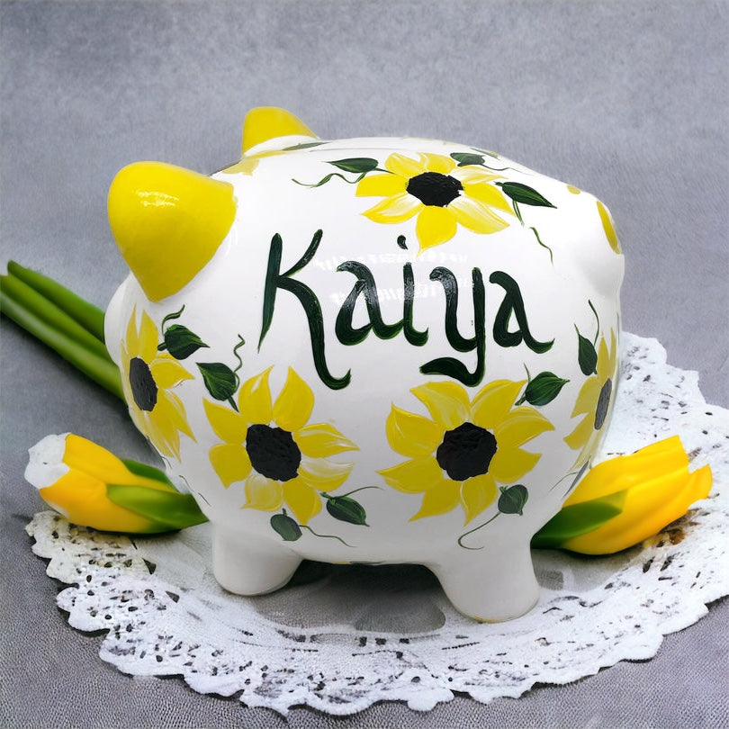 Bright and cheerful sunflowers adorn this beautiful hand painted custom piggy bank. Wonderful to give as a baby shower gift, baptism gift, or a birthday gift for a little girl. All piggy banks are 100% hand-painted and make the perfect personalized keepsake for any baby, child or adult! A new baby gift that will make saving money fun for all!