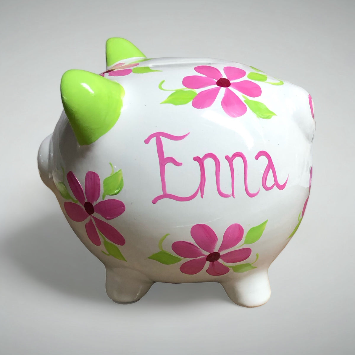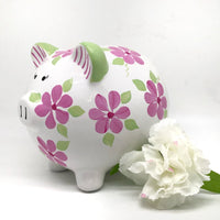 Personalized Piggy Bank. A beautiful hand painted new baby gift, with light pink daisy flowers and sage green leaves. A wonderful baby shower gift, baptism gift, or a birthday gift for a little girl. All piggy banks are 100% hand-painted and make the perfect personalized keepsake for any baby, child or adult! Custom Piggy Banks that will make saving money fun for all!