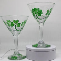 Three Leaf Clover Irish Martini Glasses for your favorite Irishman or Irish Woman. These hand painted martini glasses make a great gift for St Patrick's Day or any day you're feeling a bit Irish. Bright green shamrocks encircle the glass along with lighter green accents. Tuck inside of a gift bag with a bottle of their favorite gin or vodka and you have a wonderful housewarming gift for an Irish friend.
